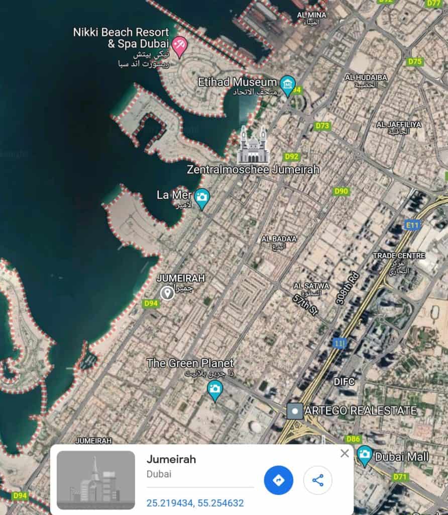 Vom Burj al Arab bis zum Port de la Mer erstreckt sich der Jumeirah District 1,2,3. Auf der einen Seite sehr nah an der Palm Jumeirah gelegen, erstreckt sich der beliebte Küstenabschnitt bis zum La Mer Beach, welcher parallel zu Downtown liegt. Neben den unzähligen Townhäusern und Villen, sind hier in den letzten Jahren viele Neubauprojekte entstanden und entstehen weiter. Bei Locals und Touristen gleichermaßen beliebt, ist der 20 km Lange Sandstrand welcher viele Beachclubs und öffentliche Strände bietet.