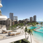 Das Projekt besteht aus vier Wohngebäuden, die über eine grüne Podiumsebene und einen Infinity-Pool miteinander verbunden sind.